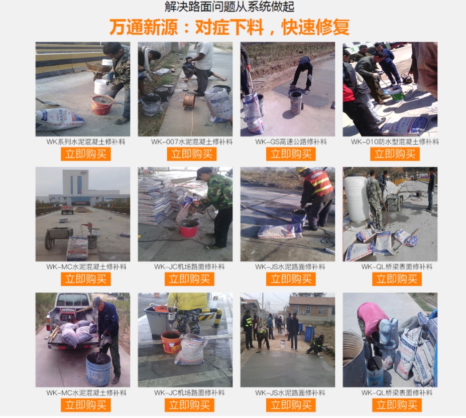水泥混凝土修補專家----萬通新源中國專業水泥混凝土修補料材料供應商!水泥混凝土修補料專門針對水泥混凝土路面的麻面、空鼓、起皮、脫殼、裂縫、漏筋等病害進行及時修補,直接涂抹在病害部位即可,有好的抗壓和粘接強度,可實現薄層修補,在高速和高壓的行車狀態下不會出現破碎和脫落現象;凡是水泥混凝土表面病害均適用于本材料。